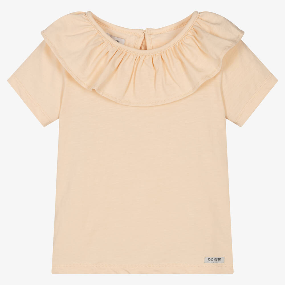 Pale pastel orange T-shirt for girls by Dutch brand Donsje, with a large ruffle collar for a pretty touch. Handmade in soft cotton slub jersey, it has a single button fastening on the back and an embroidered logo tab on the front hem.
