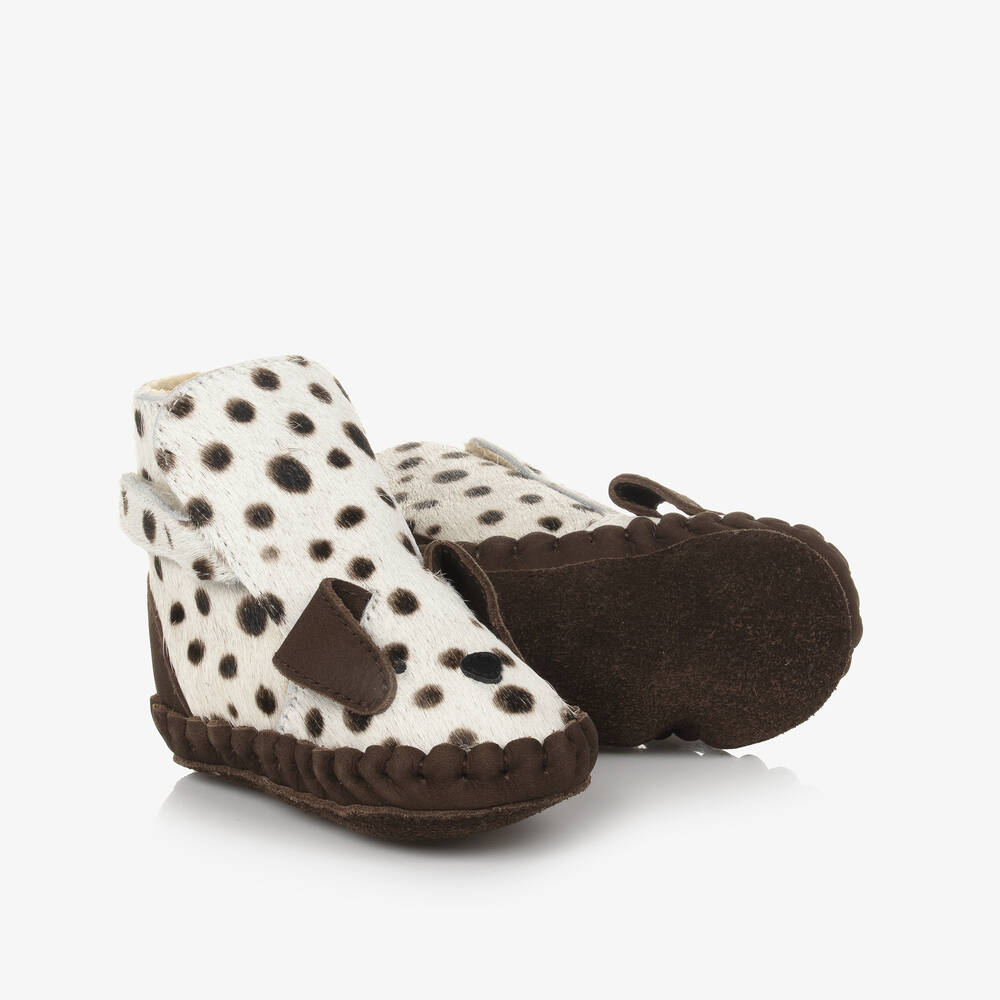 Cute ivory and brown leather pre-walker boots for baby boys and girls from Dutch brand Donsje. Designed as a cute Dalmatian dog with spotty fur, they have embroidered facial features on the front and sweet appliqué ears. They are lined in soft faux fur for comfort and warmth and have a velcro strap fastening on one side for a secure fit. The smaller sizes have a soft, suede leather sole, whilst the larger sizes have a flexible rubber sole, idea for taking those first steps.