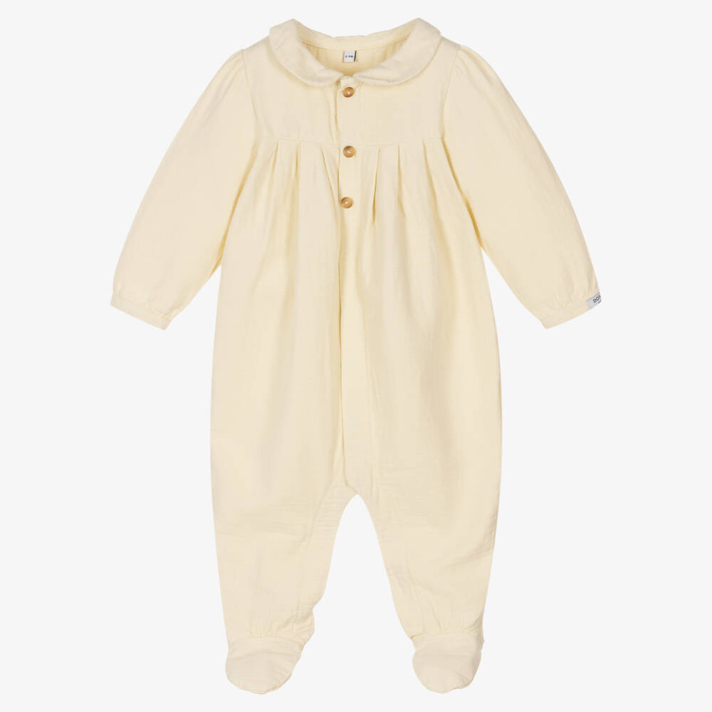 Cosy yellow babygrow for boys and girls by Donsje, made in mid-weight organic cotton. A traditional style, it has a rounded collar, puffed sleeves and pleats from the bodice for a comfortable relaxed shape. There are button and popper fastenings on the front, between the legs and on the cuffs, with an embroidered logo tab on one sleeve.