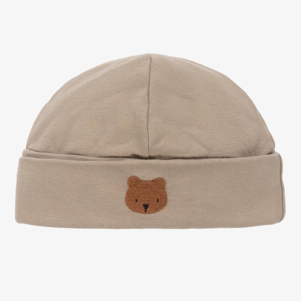 Pale khaki green hat for baby boys and girls from Donsje, made in soft organic cotton jersey. Comfortable and cosy, it has a turn-up brim with a hand-embroidered tan-brown bear on the front. An embroidered logo on the back gives a subtle designer touch.
