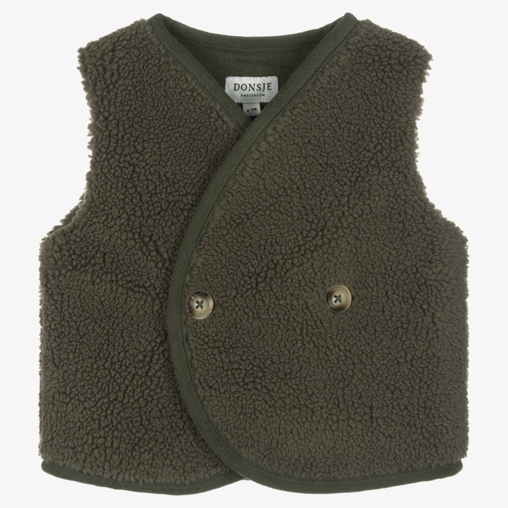 Lovely khaki green gilet for little boys and girls by Donsje, made in soft faux shearling. It has two faux tortoise shell buttons fastening the front, and a soft cotton twill lining for comfort.