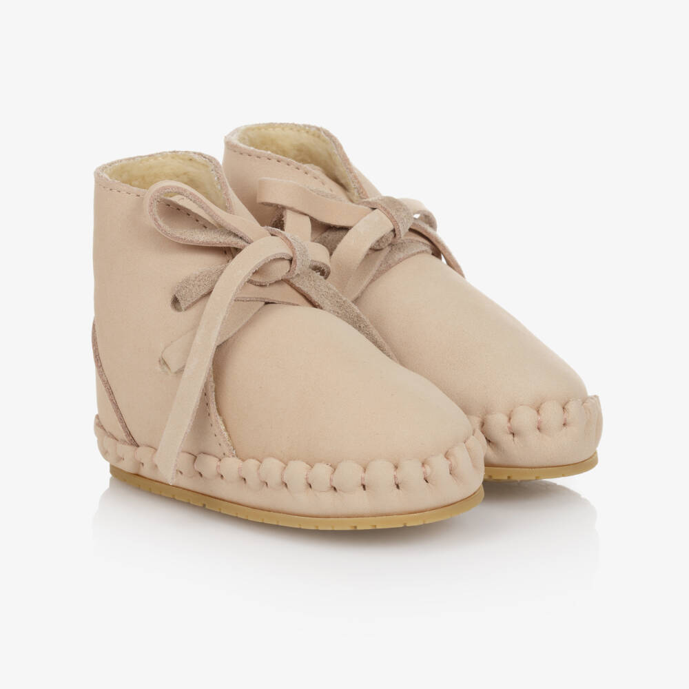 Baby girls pale powder pink boots from Donsje, made in super soft nubuck leather. They have a soft and cosy ivory faux fur lining, stitched detail around the soles, and leather ties to fasten. Smaller sizes have a suede leather outer sole, with a flexible rubber sole for larger sizes, perfect for taking those first steps.