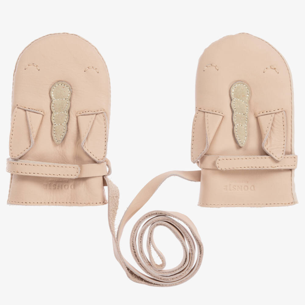 Beige leather Unicorn mittens by Dutch brand Donsje, handmade in soft leather and lined in soft eco fur. These adorable mittens have a strap to thread through coat sleeves and practical water resistant canvas on the palms.