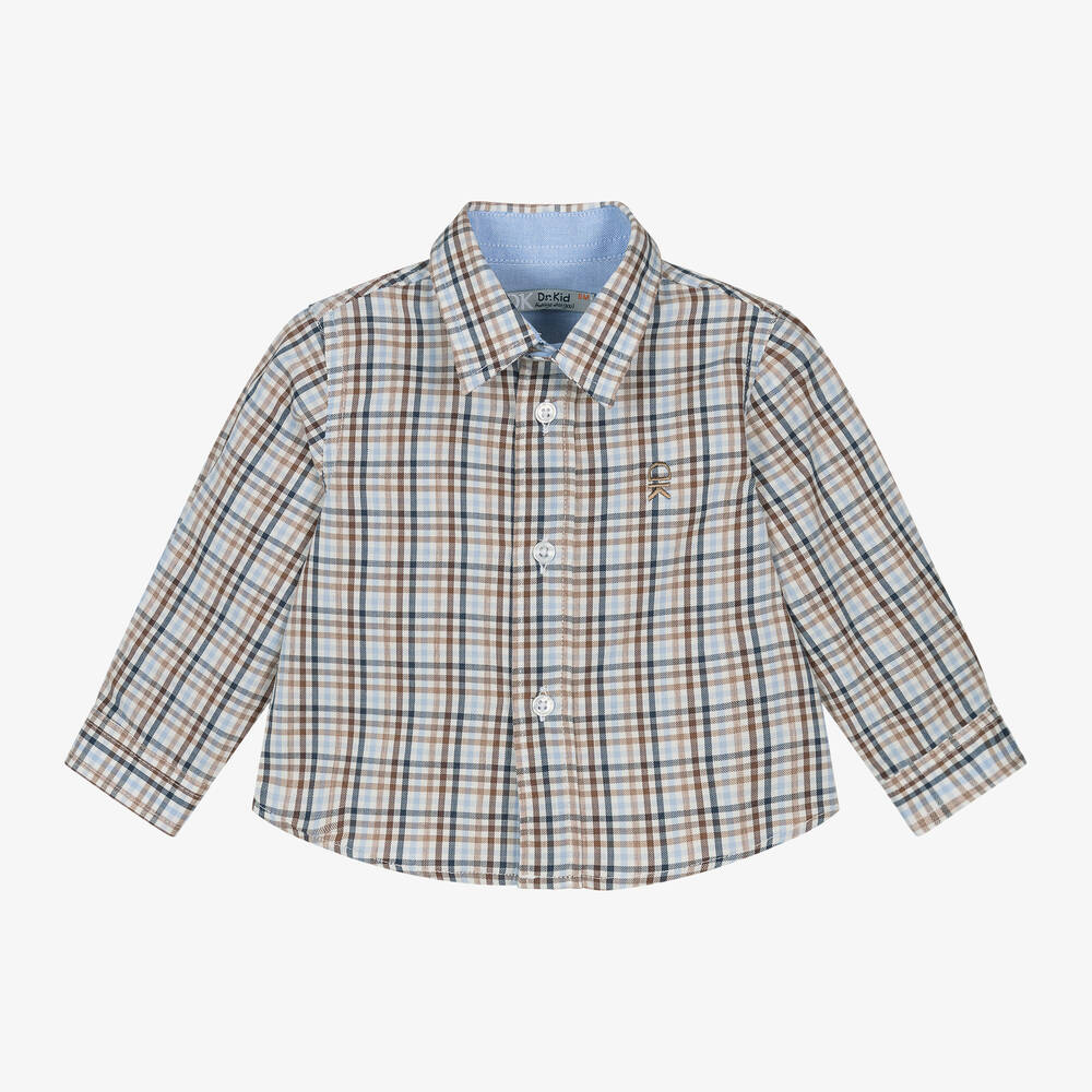 In a blue, beige and ivory check, this smart-casual shirt for baby boys is by Dr. Kid. It is woven in soft cotton, with blue Oxford cotton trims on the inner collar and cuffs. It fastens with pearlescent buttons and has monogram logo embroidery on the chest.