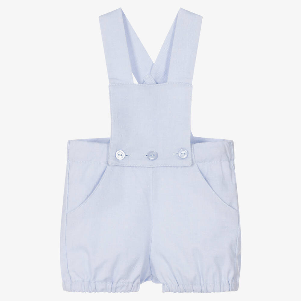 Light blue dungaree shorts for baby boys by Dr. Kid, made in lightweight oxford cotton. Soft and comfortable, they have a detachable bib front with shoulder straps that cross over on the back. Versatile and easy to wear, there are three decorative buttons on the waist and elasticated trims for extra comfort.