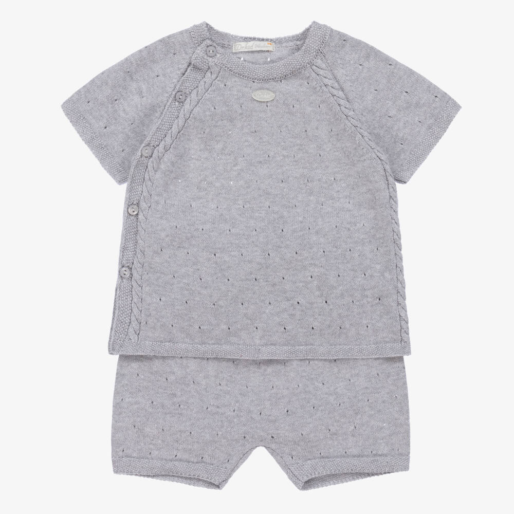 Grey knitted shorts set for baby boys by Dr. Kid, made in soft cotton for babies delicate skin. The cut-out T-shirt has cable knit trims, button fastenings on one side, and a glossy logo charm on the front. It pairs with matching grey stretchy shorts to complete the coordinated set.