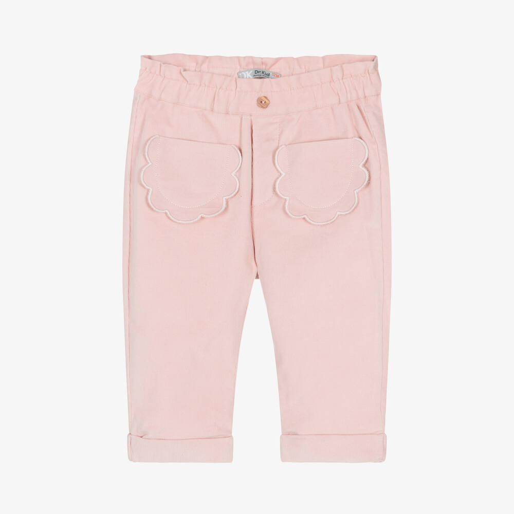 Light pink trousers for baby girls by Dr. Kid, made in soft cotton needlecord. Super sweet, they have flower-shaped, a wood-effect decorative button on the front and scallop-edged pockets designed to look like petals. The paper-bag waist is elasticated, convenient for quick dressing.