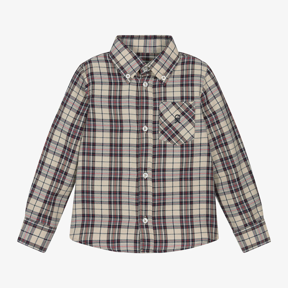 Smart-casual shirt for boys by Dr. Kid, in a beige, red and navy blue check. Made in a soft cotton blend, it is woven in lightweight twill and has a button-down collar. There are pearlescent button fastenings, with an embroidered black monogram logo on the chest pocket.