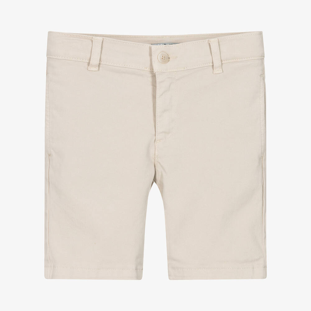 Classic beige chino shorts for boys by Dr. Kid, made from soft and stretchy cotton. They have neatly concealed front pockets, faux back pockets and a tonal logo embroidery. They fasten with a button and zip and have an adjustable waistband for a great fit.