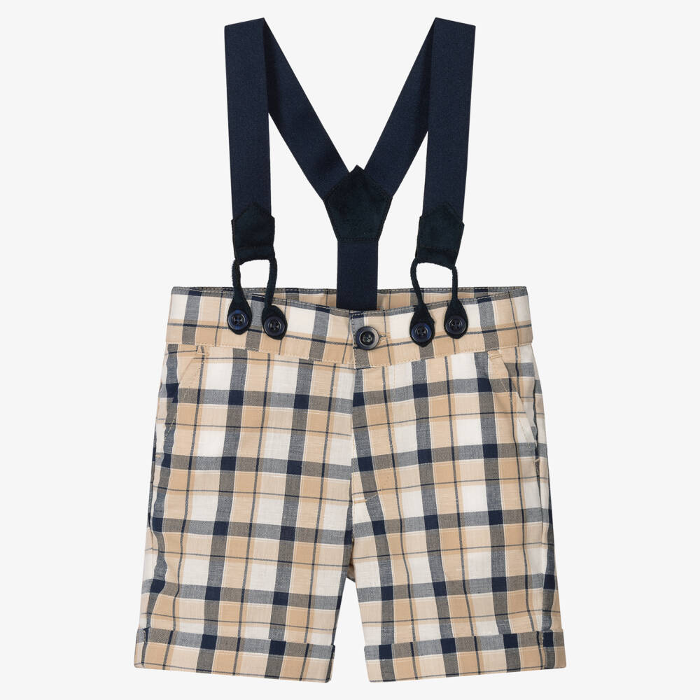 Beige, navy blue and ivory check shorts for little boys by Dr. Kid, made in a soft and lightweight linen and cotton blend. Bringing a traditional look, they have front pockets, one back pocket and turn-up cuffs. The detachable, elasticated braces are secured with buttons against faux suede trims, and the adjustable waistband fastens with a single button on the front for a great fit.