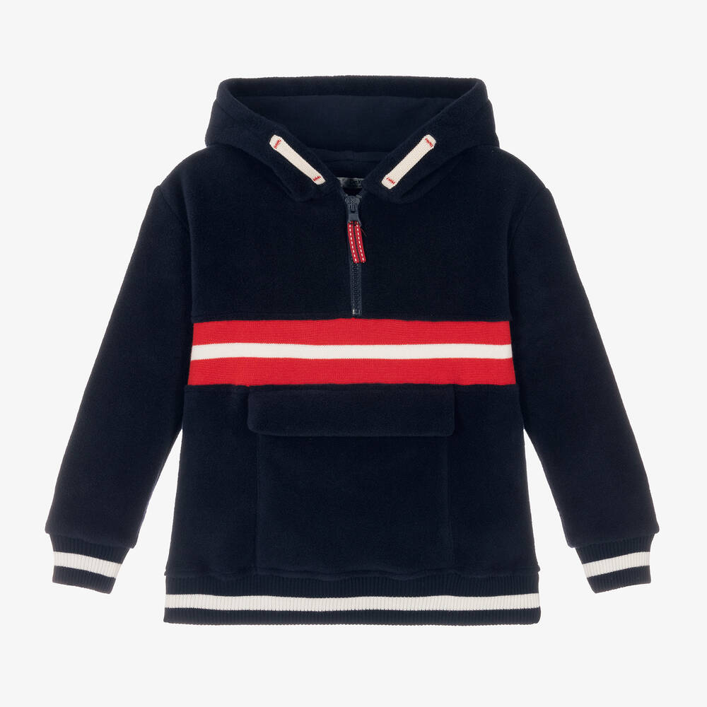 A navy blue hooded top for boys by Dr. Kid, made in super soft and cosy fleece. For a stylish contrast, it has a red and white striped, knitted panel across the front and white stripes on the ribbed trims. The hood is lined in soft jersey, with decorative tape detail and a quarter zip fastening at the neck. There is a flap pocket on the front, adding a practical touch to this casual style.