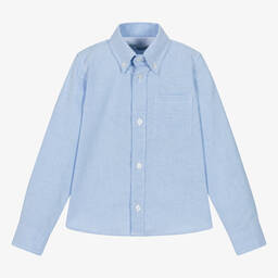 Smart blue shirt for boys by Dr. Kid, woven in soft Oxford cotton. It has a button-down collar, pearlescent button fastenings, and a tonal monogram logo embroidered on the chest pocket.