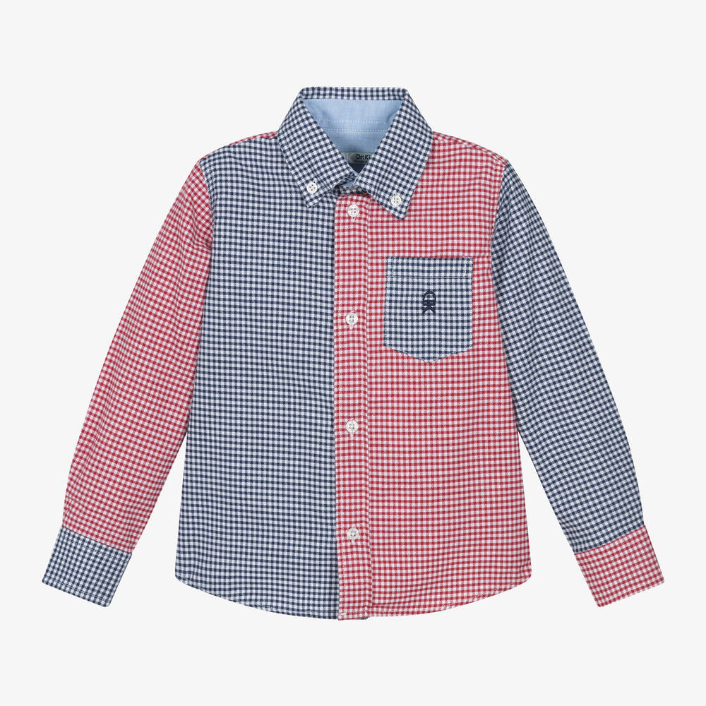 Smart-casual shirt for boys by Dr. Kid, in a navy blue and red check. It is woven in lightly brushed cotton twill. There are pearlescent button fastenings, with a navy blue monogram logo embroidered on the chest pocket.