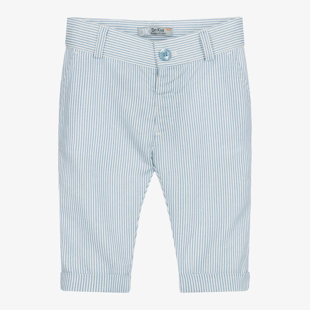 Blue and white trousers for little boys by Dr. Kid, made in a soft linen and cotton blend. They have slanted front pockets, turn-up hems and a decorative buttoned pocket on the back for a smart look. A blue button fastens neatly on the front and the adjustable waistband makes sure the fit is just right.