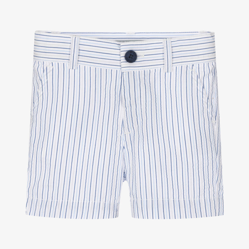 Blue and white striped shorts for little boys by Dr. Kid, made in lightweight cotton seersucker. Cool and comfortable, these cute shorts fasten with a single button and are made with an adjustable waist for a good fit. There are pockets on the front and back, and belt loops on the waist.