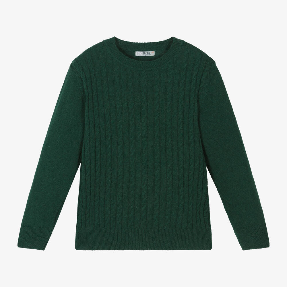 Timeless green cable knit sweater for boys by Dr. Kid, made in a soft wool blend. Great for layering and keeping your child warm, it also has stretchy ribbed trims for comfort.