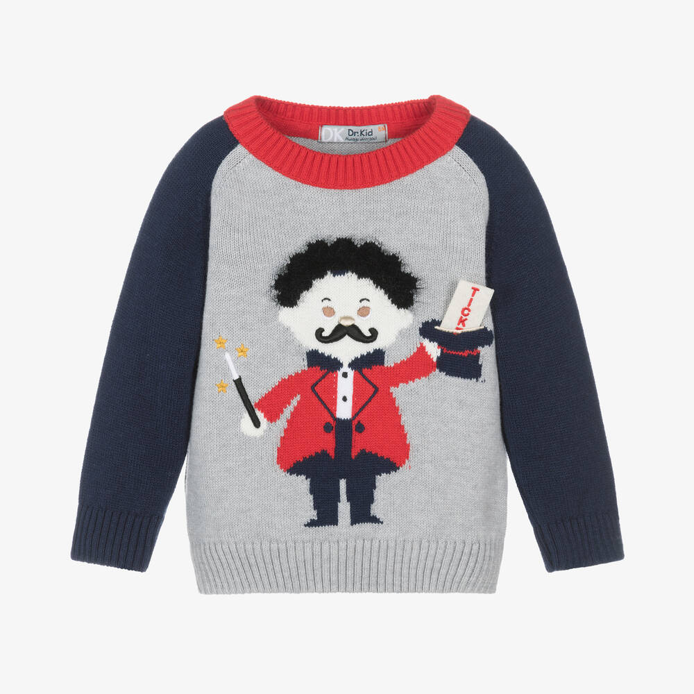 Circus-themed grey sweater for younger boys by Portuguese brand Dr. Kid, knitted in a soft blend of cotton and wool. This cosy top has navy blue long sleeves and a red crew neck. There is a fun intarsia knit ringmaster on the front with fluffy hair, embroidery detailing and a ticket appliqué popping out of his top hat. To help with dressing, smaller sizes have button fastenings on one shoulder.