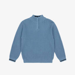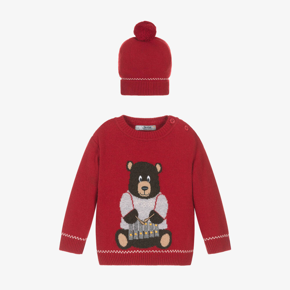 A cute red sweater and hat set for younger boys from Dr. Kid, knitted in a soft blend of cotton and wool. Lovely for those cooler months, this cosy top features an adorable intarsia knit bear on the front, playing a xylophone. It has a casual crew neckline and white patterned trims. Smaller sizes have buttons on one shoulder to help with dressing. A matching bobble hat completes the sweet look.