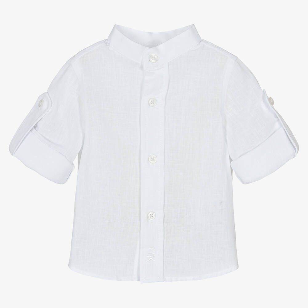 A classic white shirt for little boys by Dr. Kid, made in a beautifully lightweight cotton and linen blend. Smart with a stand-up collar, it has front button fastenings and button barrel cuffs. There is logo embroidery on the bottom of the placket for a subtle branded touch.