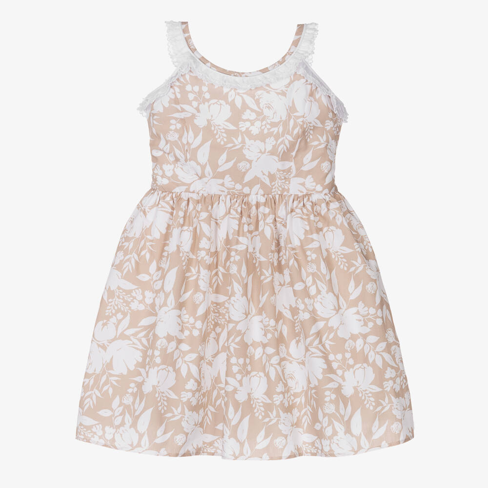 Lovely beige dress sleeveless dress for girls from Dr. Kid. Made in smooth cotton poplin, it is printed with a white floral pattern and trimmed with picot embroidery. On the back it fastens with a concealed zip and has a sash belt which bows for a pretty finish.