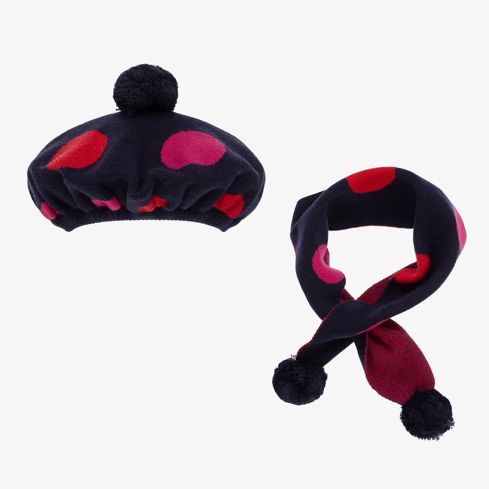 Charming navy blue beret and scarf set for younger girls by Dr Kid, knitted in a soft cotton and wool blend. Warm and cosy, both pieces are patterned with fun large red and fuchsia pink dots. The beret has a ribbed, elasticated brim for a good fit and a cute pom-pom on the top. The versatile scarf has matching pom-poms on the ends and a slit on one side so it can be worn in a crossover style.