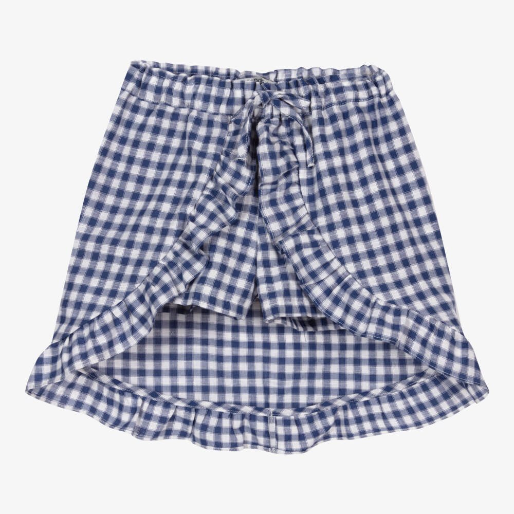 Girls white and navy blue gingham check skort from Dr. Kid, made in a mid-weight cotton and linen blend. In a pull-on style, the waist is elasticated with a tied bow on the front. The ruffle-trimmed skirt is open on the front to reveal the attached shorts and scoops to knee length on the back.