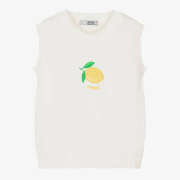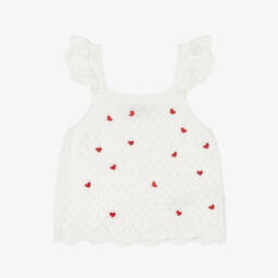 A lovely blue cotton top for girls by Dr. Kid, in a pretty lace knit pattern. This sleeveless top has frilly shoulder straps and pale pink flowers stitched on the front. Sits on the waist, it has pretty scalloped trims in a matching pink hue adding a playful finishing touch.