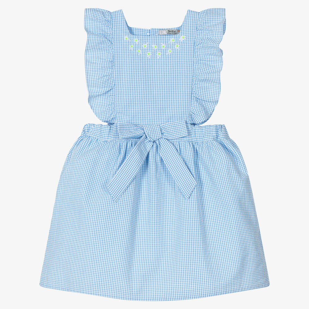 Pretty blue and white micro gingham check dress for girls by Portuguese brand Dr. Kid. It is made in cotton seersucker with a lightweight lining and neat, covered buttons on the back to fasten. Designed with elasticated cut-out detail on the sides, it is stylish to be worn on its own or as a pinafore dress. There are lovely ruffles on the sides, white and bright green embroidered flowers under the neckline and a fixed bow on the front for a sweet finishing touch.