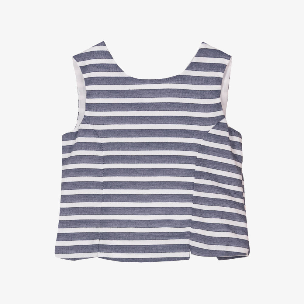 Chic sleeveless blouse for girls by Dr. Kid, made with navy blue and white striped cotton. It has a wrap-over style open back with button fastenings, highlighted with a large white bow to finish off the look. In a fitted silhouette, this stylish top is fully lined in cotton voile for comfort.