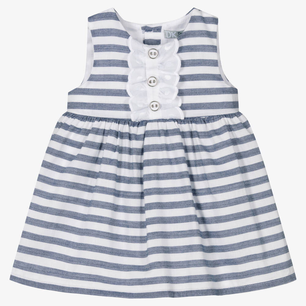 Adorable navy blue and white striped dress for little girls by Dr. Kid. Made in lightweight cotton with full lining, it is gathered around the waist for a fuller skirt. The front is decorated with white polka dot embroidered ruffles with button trims to match the sweet fixed bow on the back. It fastens with matching white and silver buttons on the back.