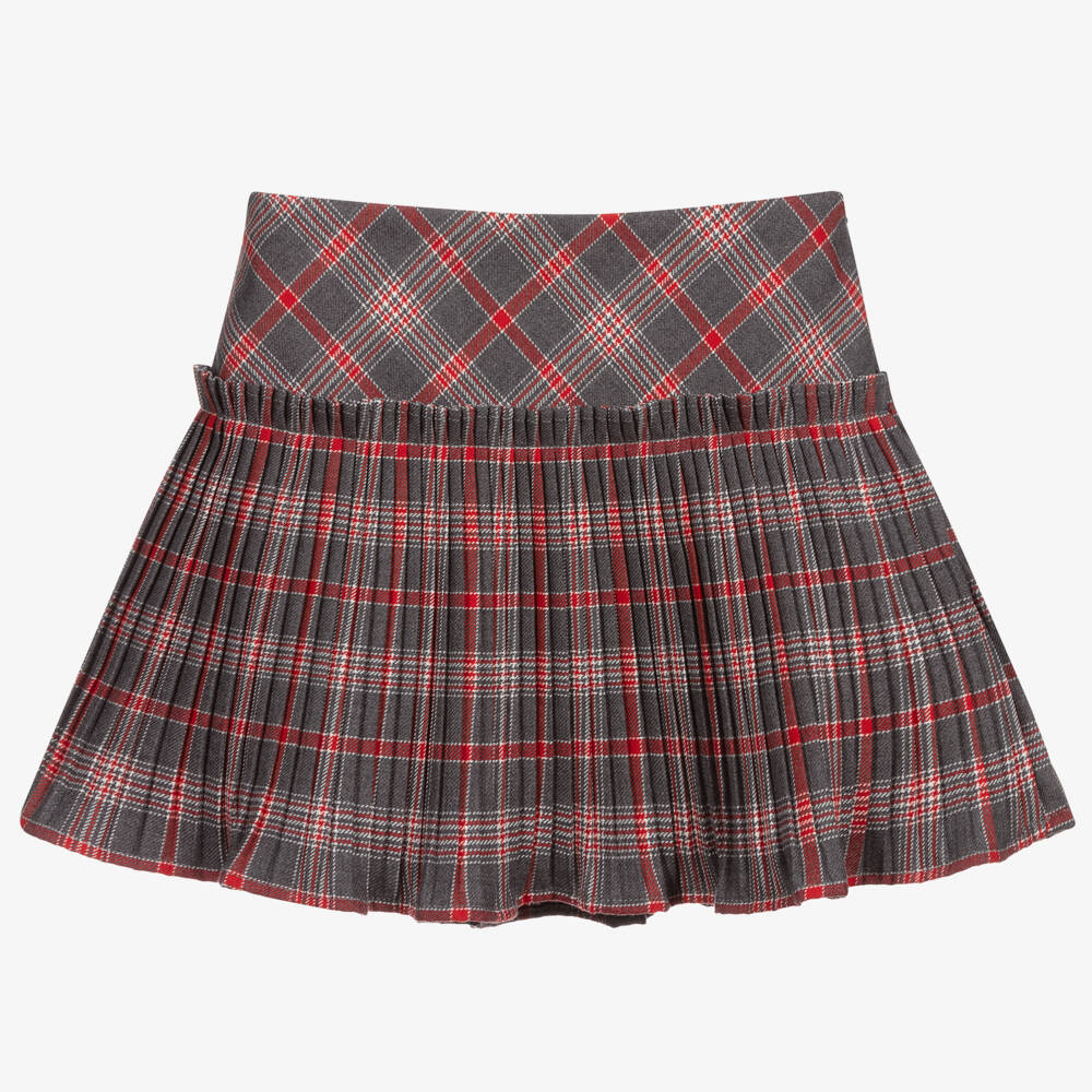 Girls grey and red checked skirt by Dr. Kid, made in soft viscose blend twill with a lightweight lining. It has a deep waistband and a finely pleated skirt with a pretty frilled hem. The skirt has a side zip fastening and an adjustable waistband for a comfortable fit.