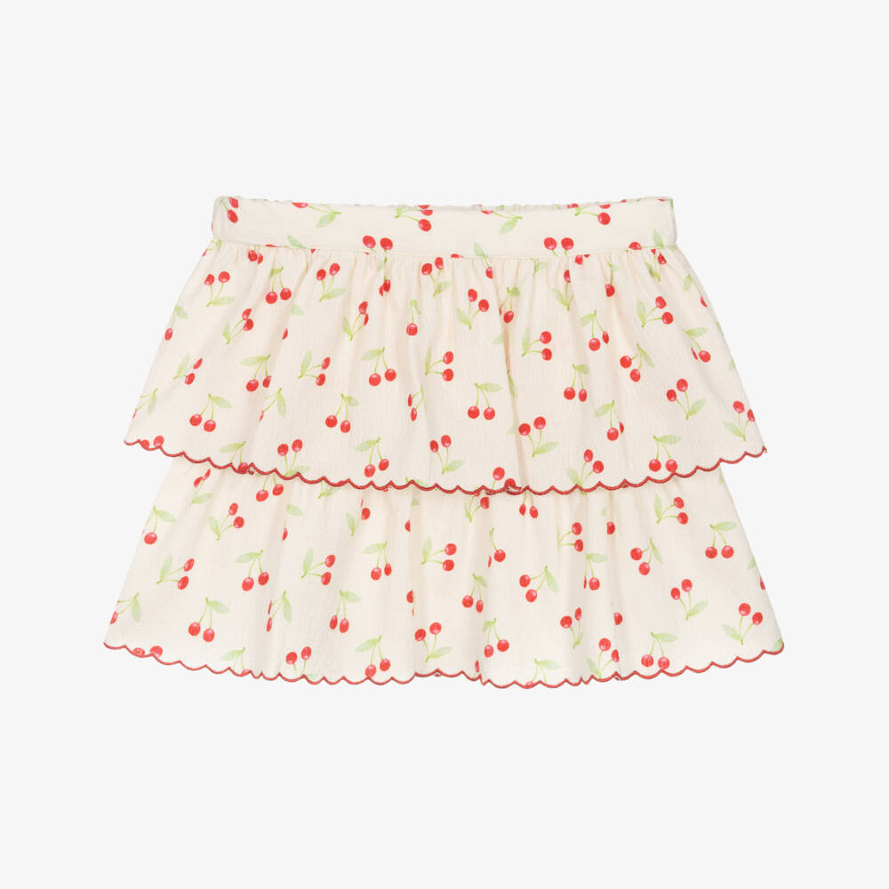 Gorgeous ivory cherry print skirt for girls by Dr. Kid, softly woven in lightweight, basket-weave cotton. The tiers have pretty scalloped edges embroidered in red, and the waist is adjustable for a comfortable fit.