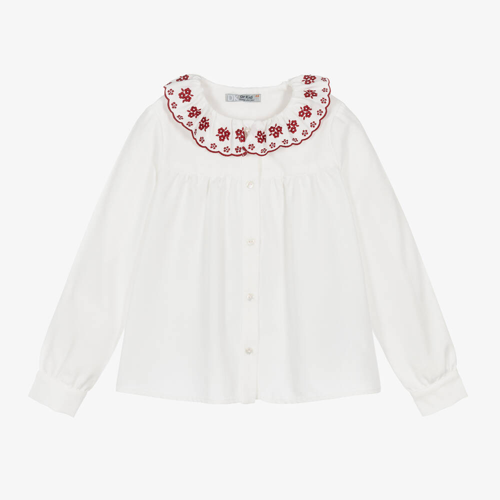 Pretty ivory top for girls by Dr. Kid, softly woven in cotton-blend twill. A ruffle collar, beautifully embroidered with red florals, adds a traditional touch to the piece. There are glossy button fastenings on the front and on the cuffs.