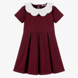 Girls smart navy blue Milano dress by Dr. Kid, with a scalloped white twill collar, prettily embroidered and sparkling with little blue rhinestones. The dress is made in soft, viscose-blend Milano jersey, which drapes beautifully and keeps its shape. It has a box pleated skirt and a concealed zip fastening around the back.