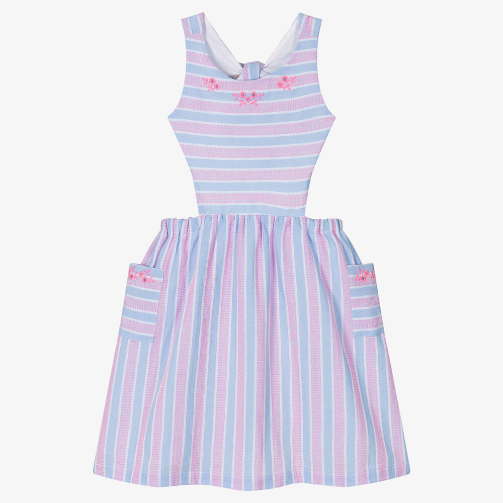 Stylish pink and blue dress for girls from Dr. Kid, made in lightweight cotton blend. It has bright pink stitched stripes to catch the eye, and is finished with sweet floral embroidery on the chest and front pockets. The waist and back are cut out for a fashion-forward silhouette whilst fastening with a large sash bow on the back for a traditional touch.