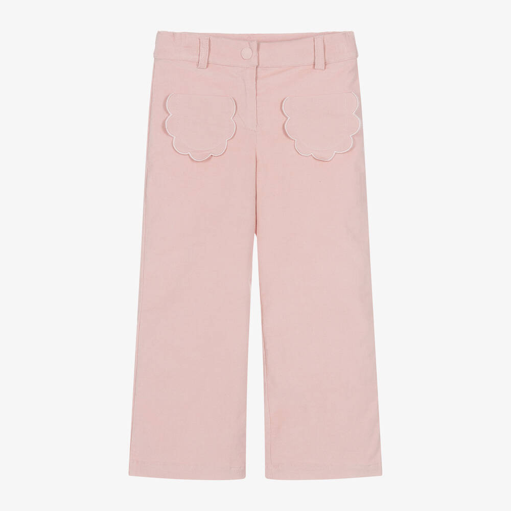 Light pink cotton trousers for girls by Dr. Kid, made in soft needlecord. These wide-leg trousers have scallop-edged patch pockets designed to look like flower petals. The waist is elasticated and adjustable, and they fasten with a front popper and zip closure.