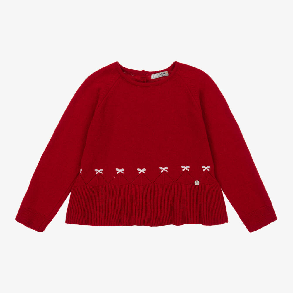 Girls red sweater by Dr. Kid, knitted in a delicate wool and cotton blend. Stylish and comfortable, this peplum style top has white bows embroidered around the hem, with intricate pointelle detailing, and cosy ribbed trims. It fastens with logo embossed buttons on the back.