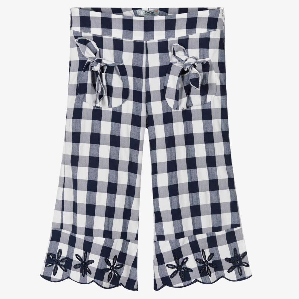Lovely white and navy blue gingham trousers for girls from Dr. Kid. Made in smooth cotton blend poplin and with a wide cut leg, they are cool and comfortable. The waist is lightly elasticated and adjustable for a better fit, whilst the concealed side seam zip makes them easy to pull on. They are finished with front pockets with bows and cut-out floral embroidery around the ankles.