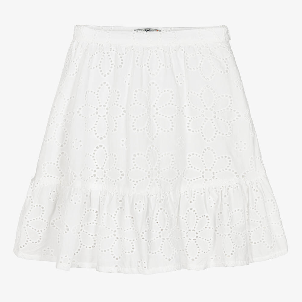 In floral broderie anglaise, this pretty white skirt for girls is by Dr. Kid. It is made and lined in lightweight cotton, with a charming frilled hem. There is an adjustable waistband for a comfortable fit and a concealed zip fastening on the side.