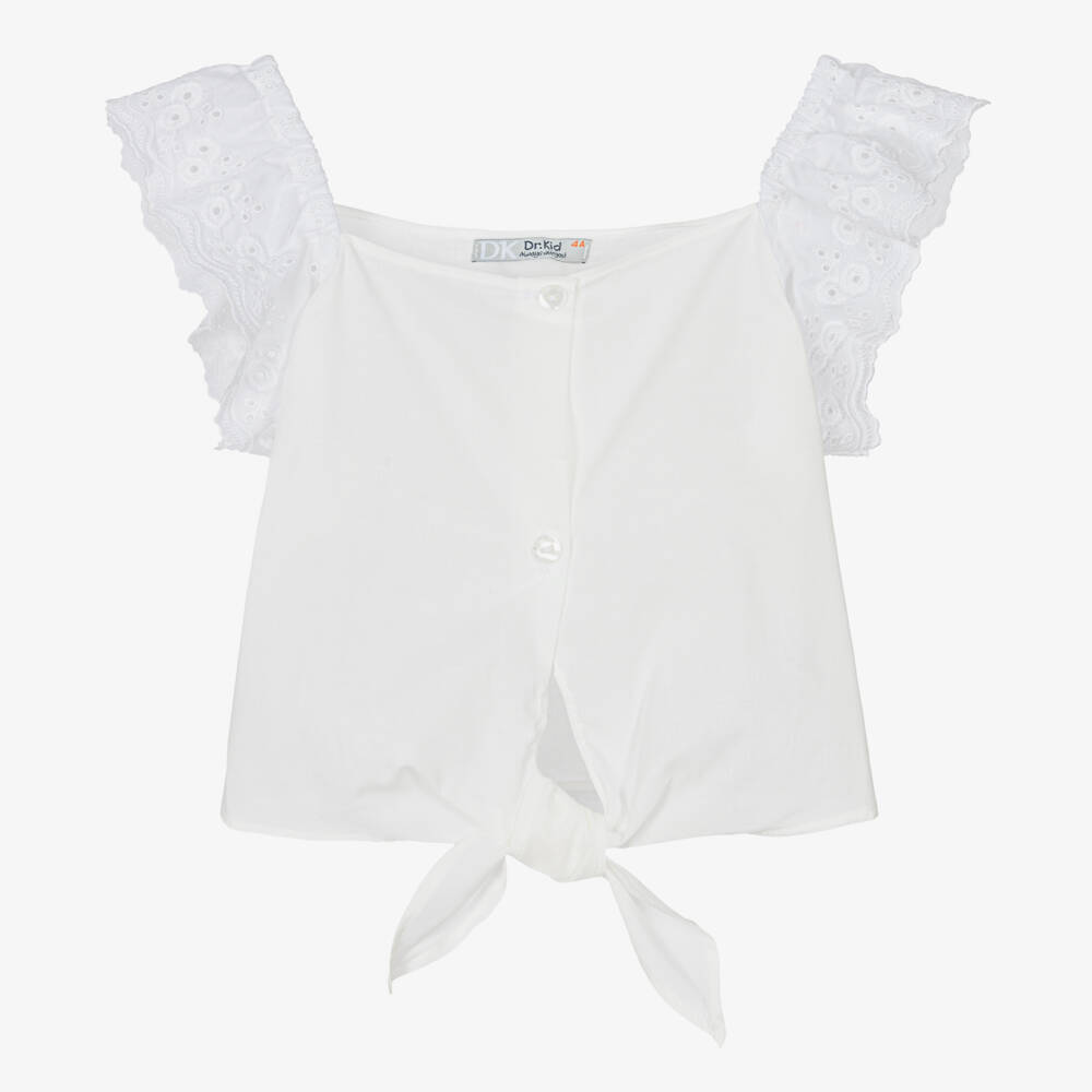 A lovely white blouse for girls by Dr. Kid, made in sheer and lightweight cotton voile. It has pretty broderie anglaise ruffle sleeves that are elasticated over the shoulders. There are button fastenings down the front, with a knotted tie detail.