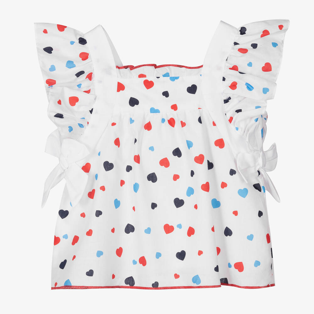 White with a blue and red heart pattern, this charming blouse for little girls is by Dr. Kid. Made in lightweight cotton, it has feminine ruffles over the shoulders and pretty fixed bows at the sides. Fully lined for comfort, it fastens with a red heart-shaped button on the back.