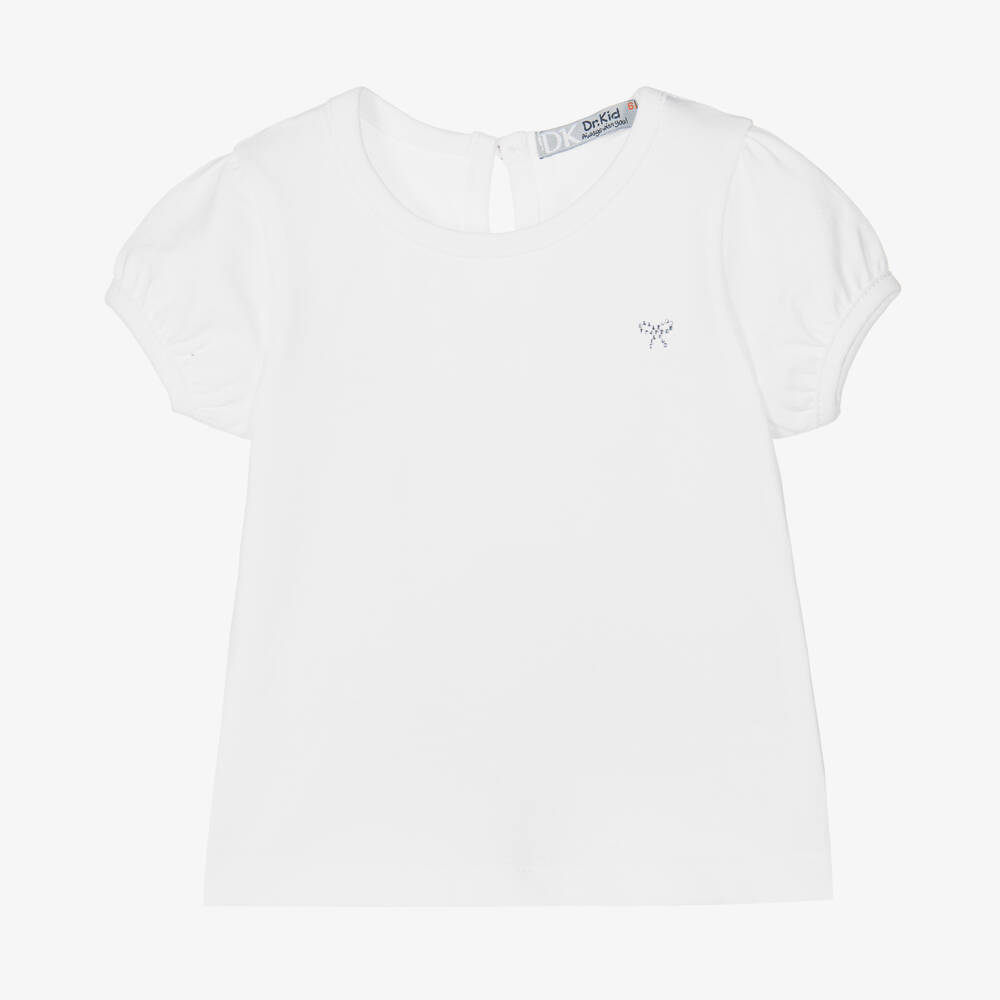 White T-shirt for little girls by Dr. Kid, made in soft and comfortable cotton jersey. It has pretty puffed sleeves and an elegant keyhole button fastening on the back. There is a small sparkly diamanté bow on the chest.
