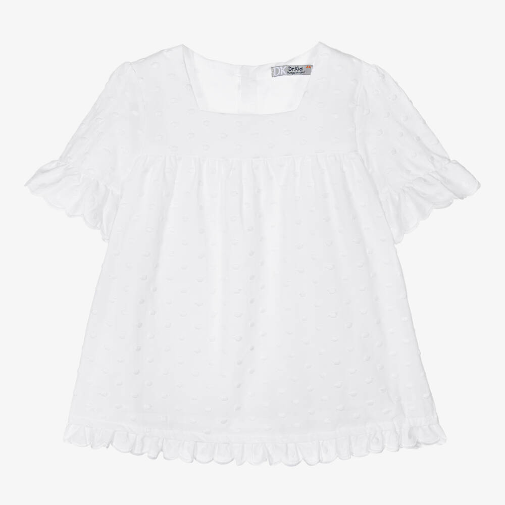 Beautiful white dress for girls by Portuguese brand Dr. Kid. Made and lined in soft cotton voile in a boxy fit, it is patterned with cute embroidered white polka dot. It has a square neckline and sweet ruffle trims with embroidered scalloped edges. There are covered buttons to fasten on the back for neat finish.
