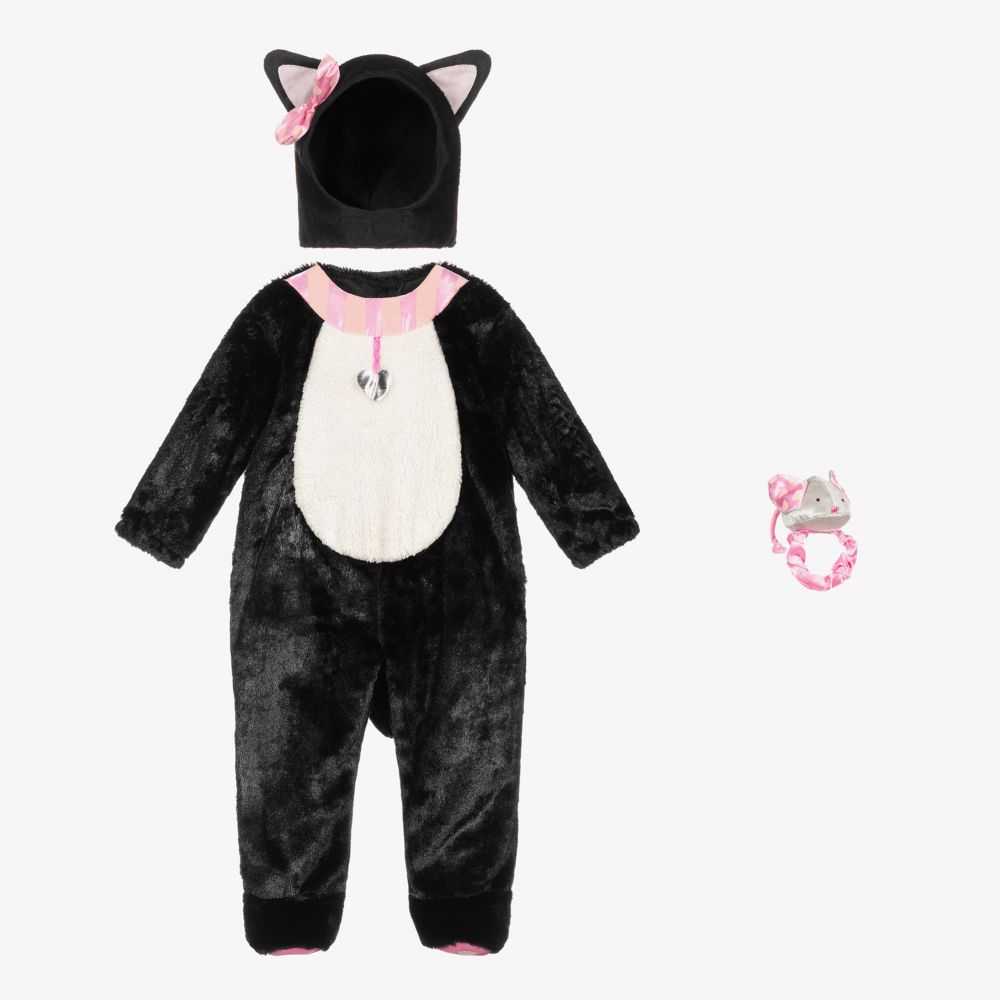 Baby girls black and white, 'Itty Bitty Kitty' costume from Dress Up by Design, made from soft plush. The one-piece has a white fluffy bib, a striped collar with a silver appliqué heart, and pretty pink paw details on the soles of the feet. There are practical velcro fastenings on the back and it has a detachable tail. The coordinating hood has cute cate ears and a lovely pink satin bow, and there is a grey mouse wrist rattle to complete the look.