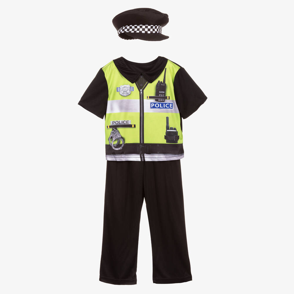 Boys 'Police Officer' dressing-up costume by Dress Up by Design, great for imaginative play. Made in recycled polyester jersey, the costume consists of a black top, trousers and hat. The top is printed with a green zip-up vest on the front, complete with a police officer badge, two-way radio and handcuffs for an authentic feel. Great for hours of endless fun, your child can enjoy dressing up in their new favourite uniform.