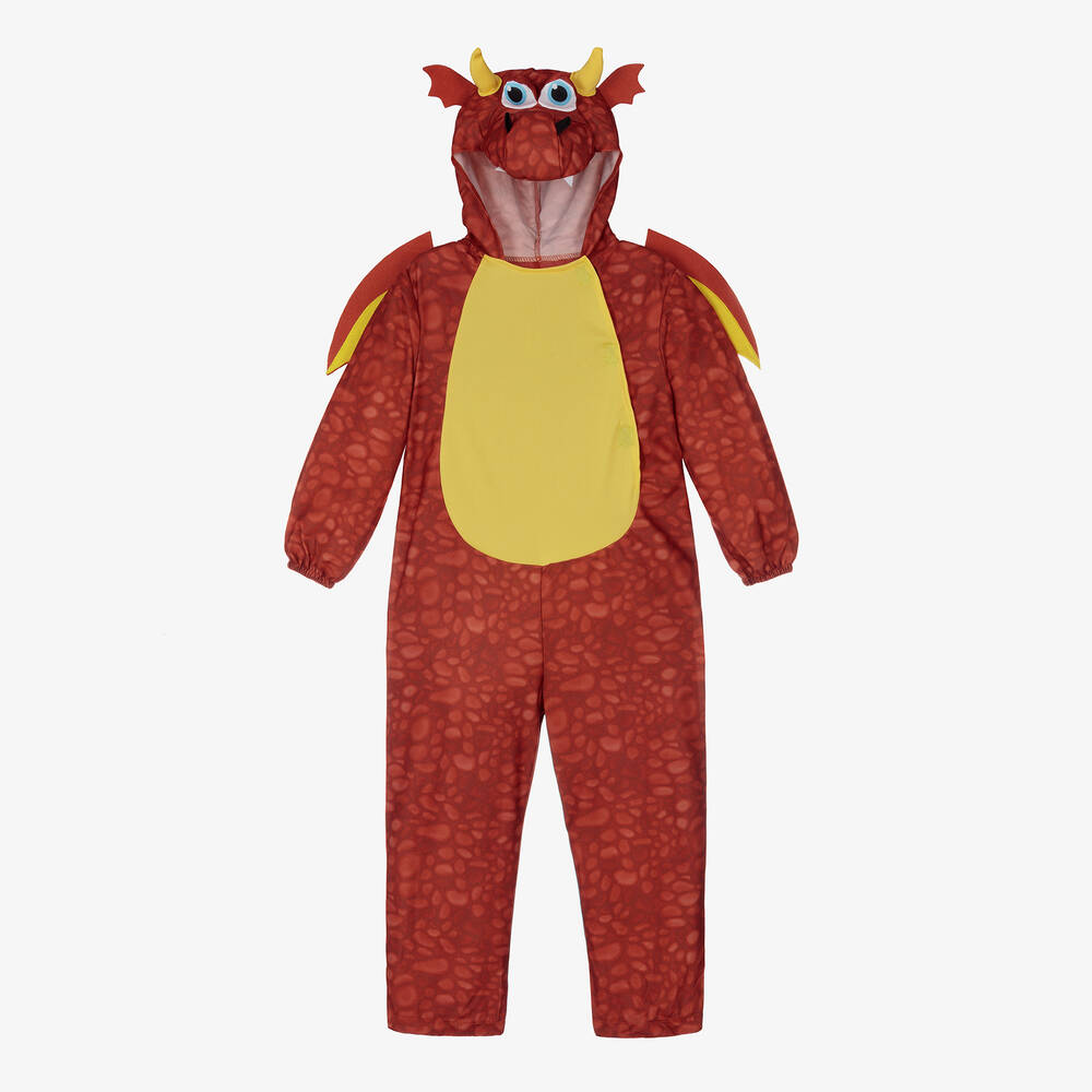 Fun brick red dragon costume for boys and girls from Dress Up by Design, printed with a dinosaur skin pattern. The hood is constructed in the shape of a dragon face, with yellow horns, a padded snout and large blue eyes. The removable bright yellow wings and spiny tail attach easily with velcro to complete the outfit. Made from soft brushed fabric with stretchy jersey trims, it has velcro fastenings on the front for easy dressing.