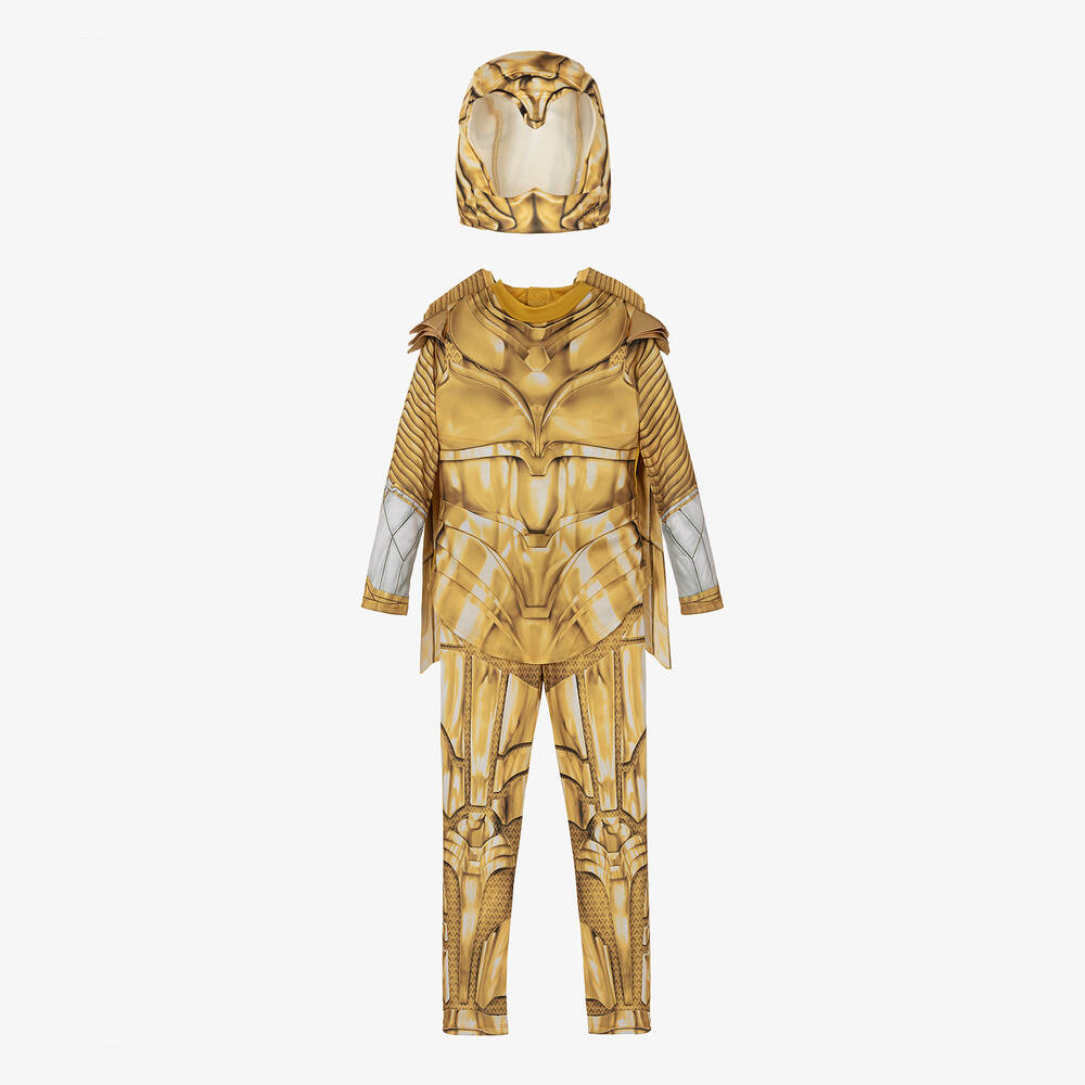 Girls can take on the world with this powerful, officially licensed Wonder Woman golden armour costume from Dress Up by Design. Easy to wear, the soft and stretchy printed top has layered 3D sculpted shoulders and large wings that attach with velcro. It comes with a pair of matching stretchy leggings and a soft helmet to help save the world in style!