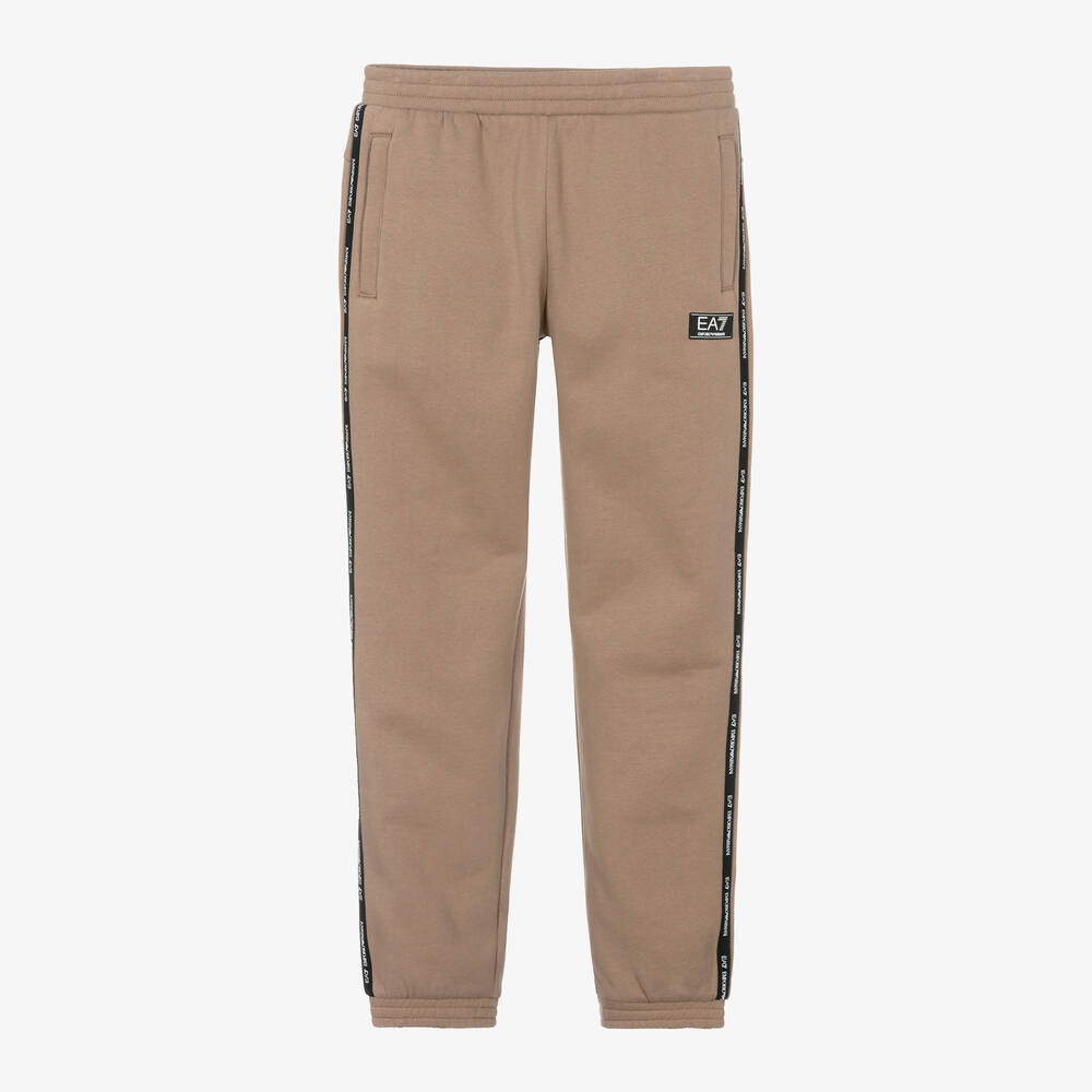 Dark beige cotton-blend jersey joggers for boys by Italian sports brand EA7 Emporio Armani,with a warm, fleecy inside. Instantly recognisable, they have the designer's EA7 rubberised patch on the front, with black logo tape down the sides. The ankles and waist are elasticated for comfort, with an internal drawstring on the waist for an ideal fit. There are useful side pockets, with zip fastenings to secure.