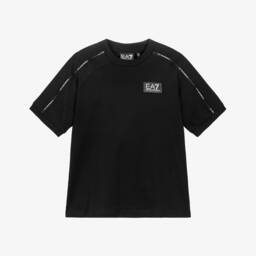 Black T-shirt for older boys by EA7 Emporio Armani, combining sporty style with comfort. Made in soft cotton jersey, it has short raglan sleeves with black, branded tape trims and a rubberised logo patch on the chest for instant designer appeal.
