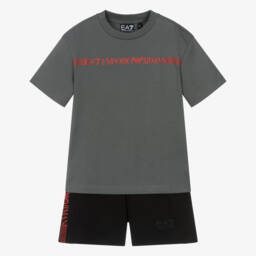 Casual black cotton shorts set for boys by EA7 Emporio Arman. The soft jersey T-shirt has a bold EA7 logo print on the front for a statement look. The mid-weight jersey shorts have side seam pockets and an elasticated waist with an internal drawstring tie to adjust the fit.